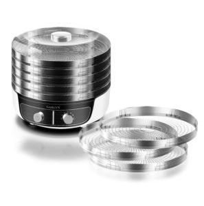 Внешне сушилка GARLYN D-08 имеет довольно стильный внешний вид. Общий объем прибора составляет 30 л – с равномерным распределением нагрузки между поддонами. Каждый из них в среднем рассчитан на большое количество ингредиентов, отличается хорошей вместимостью для подобной разновидности устройств. Нагревательный элемент расположен внизу, температура нагрева поверхности регулируется в диапазоне 35-70°C.